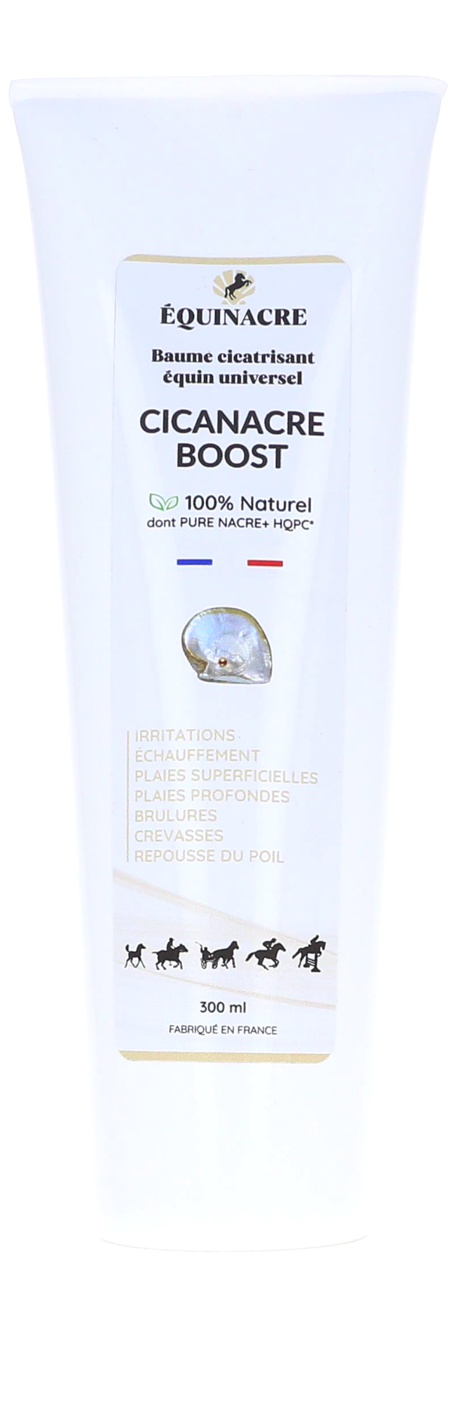 CICANACRE BOOST est un baume cicatrisant équin universel à base de nacre de Pinctada maxima à usage externe qui concentre dans sa composition tous les facteurs intervenant dans le processus de cicatrisation physiologique.