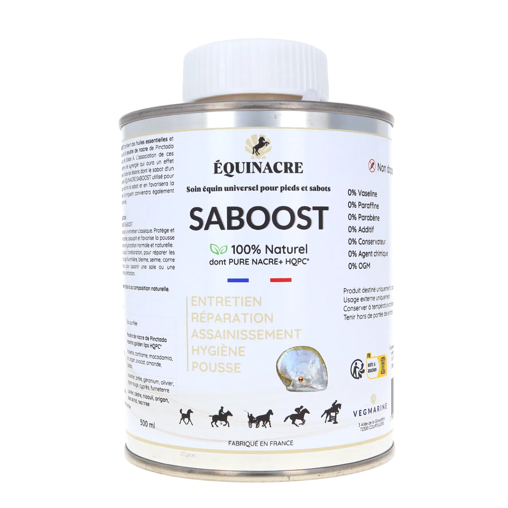 SABOOST est un onguent 100% naturel à usage externe pour le sabot et le pied du cheval. L’association de la nacre de Pinctada maxima à un complexe d’huiles végétales nourrissantes, d’extraits de végétaux réparateurs et d’huiles essentielles stimulantes de croissance permet de nourrir, assouplir, réparer la corne, accélérer sa pousse et assainir la fourchette et la sole.